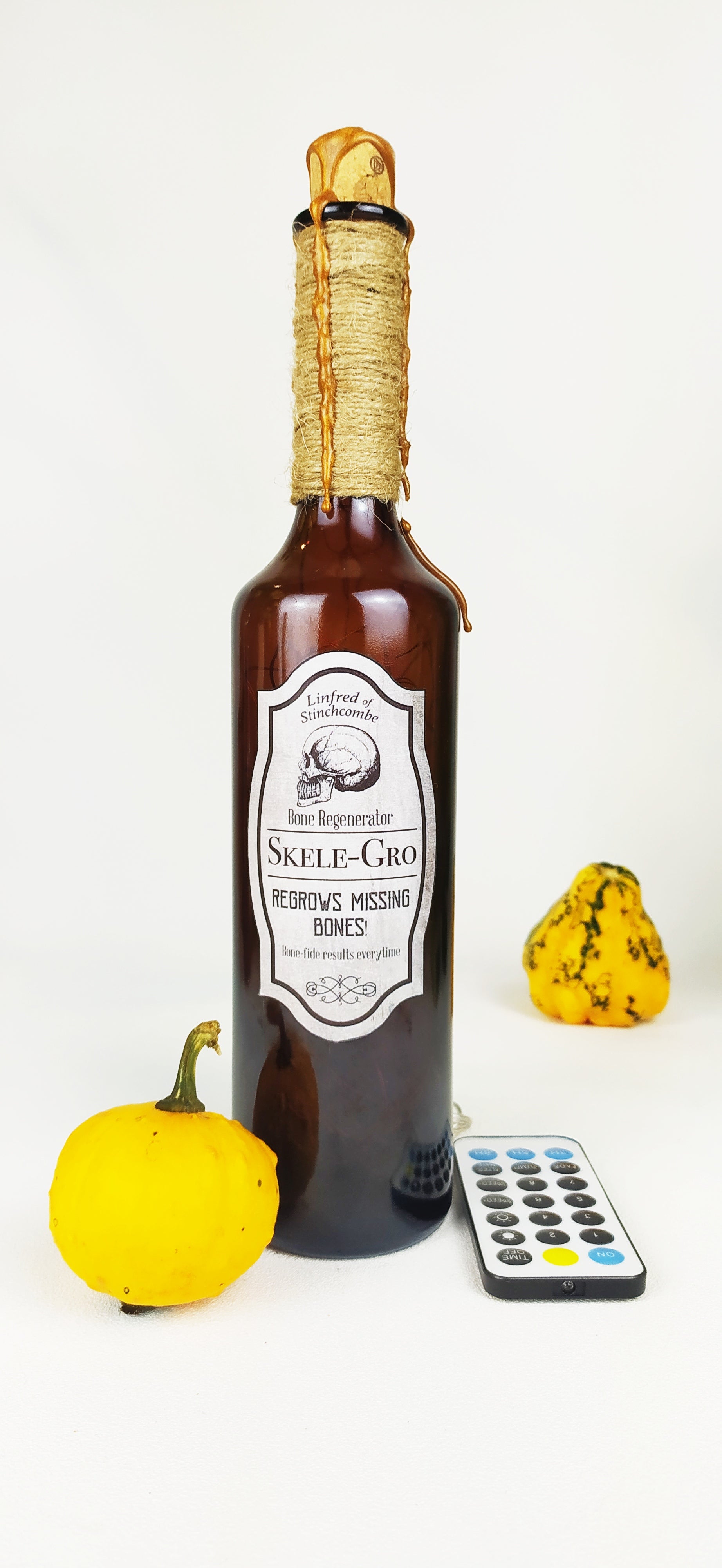 La bottiglia è stata forata, rietichettata e decorata con corda e ceralacca.